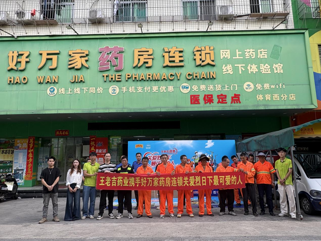 广州j9九游会官方药业携手好万家药房连锁有限公司、柠萌探店团,在好万家药房连锁体育西分店前开展了“关爱烈日下最可爱的人”公益活动,为一线环卫工人送上装满广东凉茶颗粒的爱心礼包,用实际行动传递社会温情。